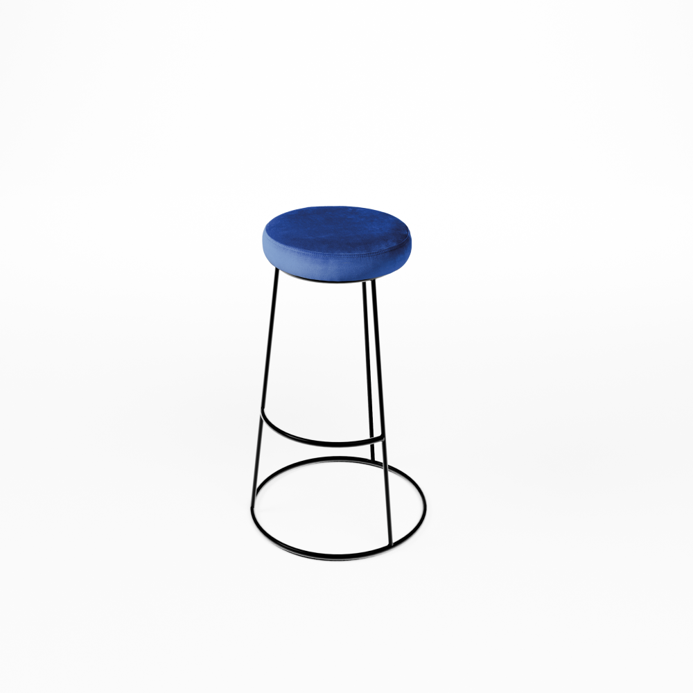 De barkruk heeft een zwart verchroomd onderstel (gunmetal black) en een fijne zachte zitting van blauw fluweel, deze is tevens verwisselbaar voor een zwarte of gouden zitting.
