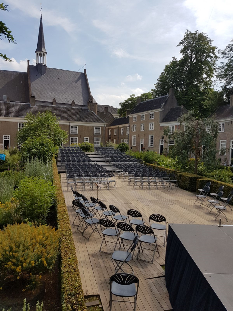 Deze stoelen worden geleverd in een kar op wielen, er kunnen maar liefst 50 stoelen tegelijk in één kar, dus efficiënt in de opslag en handig te verplaatsen.