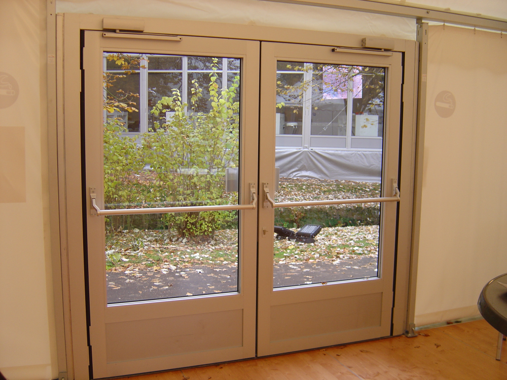 Entreedeur met glazen panelen, breedte 2 mtr. dubbele deur met push-bar en klink aan de buitenkant.