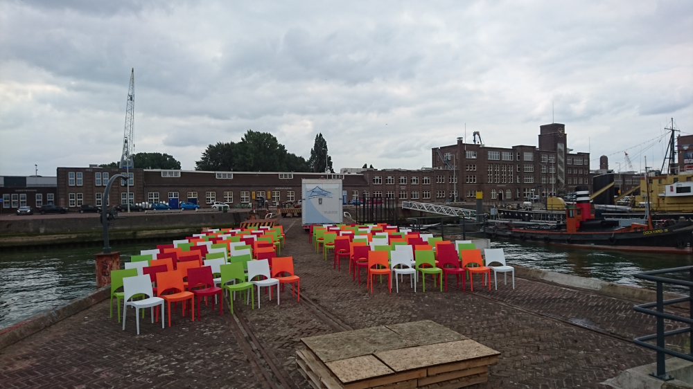 Deze stoelen worden geleverd in een kar op wielen, er kunnen 18 à 20 stoelen tegelijk in één kar, dus efficiënt in de opslag en handig te verplaatsen.